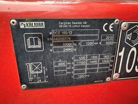 KALMAR-Dieselstapler DCE 160-12 Baujahr: 2010 11842 Betriebsstunden Tragkraft: 16000 kg / 1200 mm LSP Hubmast: Duplex-Freisicht Hubhöhe: 4000 mm Bauhöhe: 3695 mm Gabellänge: 2400 mm x 250 x 100 mm Bereifung: Luft Motor: 6-Zyl. Volvo-Diesel TAD660VE mit 147 kW Leistung - Zinkenverstellgerät mit Seitenschieber - Kalmar Komfort-Kabine "Spirit Delta" mit Heizung u. Radio - 5. Steuerventil bis zum Gabelträger - Zentralschmieranlage - STVO-Beleuchtung - LED-Arbeitsscheinwerfer vorne, hinten u. am Hubmast SEHR GUTER ZUSTAND !!! servicegepflegtes Gerät !!! Für etwaige Rückfragen steht Ihnen Herr Thomas Lehner natürlich gerne zur Verfügung !Kontaktdaten: