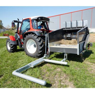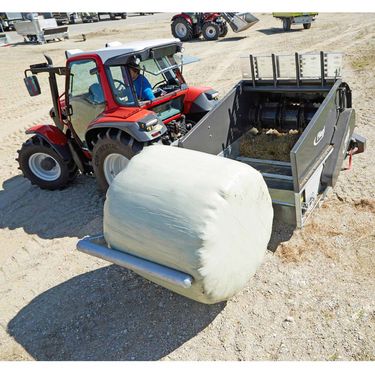 Ballenauflöser »Profi-Combi« Ausführung „rechts“ / mit Dreipunktaufnahme Der quer verlaufende Kratzboden unten schiebt den Ballen gegen die Fräse. Ein Stützkamm verhindert, dass sich die Silage um die Fräse wickelt und sorgt für eine gründliche Dosierung. Das abgefräste Futter fällt aus der Austragsöffnung direkt in den Futterbarren. Features: » Separat angeschraubte und wechselbare Klingen für feinen und exakten Schnitt des Ballens » Der Rundballen wird über einen Aufnahmearm aufgenommen » Hydraulische Anpassung des Aufnahmearms - zur besseren Aufnahme unterschiedlicher Ballenformate » Geeignet für Grassilage (geschnitten), Heu und Strohballen » Gleichmäßige Verteilung des Futters » Auch loses Futter kann dosiert eingebracht werden » Mit hydraulischen Deckel - bester Schutz vor Verletzungen Technische Details: » Hydraulischer Kratzboden – Ausbringmenge über Stromregelventil stufenlos einstellbar » Volumen: ca. 3,3 m3 » Kraftbedarf (mit Fahrwerk):Kontaktdaten: