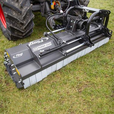 Schlegelmulcher »Turbo« Arbeitsbreite 2200 mm / mit Drehzahl 540 U/min Fliegls Schlegelmulcher »SM TURBO« hat sich besonders bei der Zerkleinerung von überflüssigem Bewuchs wie Gras, Unkraut, Rebenschnittresten oder Stielen von zum Beispiel Mais oder Sonnenblumen bewährt. Seine kompakte Größe eignet sich ideal für den Anbau an kleineren Traktoren oder Kommunaltraktoren und ist besonders praktisch im generellen Einsatz bei Mäharbeiten. Serienmäßig bestehen die Fliegl Schlegelmulcher aus einem gut verarbeiteten, lackierten Gehäuse mit besonders zuverlässigen Innenkomponenten. Die selbstreinigende, verstellbare Nivellierwalze sowie die feingewuchtete Schlegelwelle sind mit langlebigen Flanschlagern ausgestattet, die dank den leicht zugänglichen Schmiernippeln problemlos zu warten sind. Die seitlichen Gleitkufen sind ebenfalls höhenverstellbar und geben in Verbindung mit der Nivellierwalze die Schnitthöhe vor. Die Lagerung ist so ausgeführt, dass das Mähgut nicht wickeln kann und der Mulch direkt abgelegt und festgewalzt wird. Features » Hydraulische Seitenverschiebung: 350 mm » Kompakte und stabile Bauform » Optionale Federentlastung » Optionaler Keilriemenspanner Technische Details » Arbeitsbreite: 2200 mm » Gesamtbreite: ca. 2400 mm » Dreipunktaufnahme Kat. 2 » Front- und Heckanbau » Hochleistungskeilriemen: 4 » Nachlaufwalzendurchmesser: 133 mm » Rotorwalzendurchmesser: 159 mm » Hammerschlegel 24 Stück (1,05 kg/Stück) » Kraftbedarf: ca. 60 PS » Erforderliche Drehzahl: 540 U/min » Inkl. Gelenkwelle » Getriebe mit Freilaufkupplung » Einstellbare Klappe für sicheres Ablegen des Mulchguts » Einstellbare Gegenschneide für optimale Zerkleinerung » 1 Kontramesser / Gegenschneide bewirkt ein fein zerkleinertes Mulchgut » Selbstreinigung der Nachlaufwalze » Gleitkufe / Nachlaufwalze in der Höhe verstellbar » Eigengewicht: ca. 510 kgKontaktdaten: