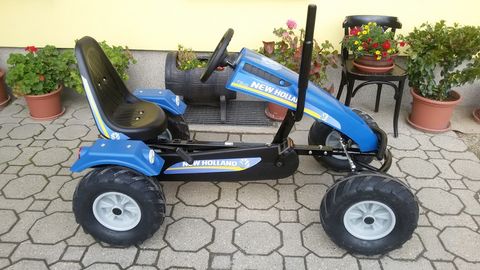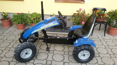 **Produktbeschreibung: Dino Cars Go Kart Tret Traktor New Holland** Entdecken Sie das aufregende Fahrerlebnis mit dem Dino Cars Go Kart Tret Traktor New Holland, einem herausragenden Kinderspielzeug der Marke Dino Cars. Dieses Modell vereint Innovation und Spaß und ist speziell dafür konzipiert, Kindern ein authentisches Traktorerlebnis zu bieten. **Hauptmerkmale:** - **Freilauf:** Der Tret Traktor ist mit einem Freilaufmechanismus ausgestattet, der es ermöglicht, die Pedale in Ruhe zu lassen, während das Fahrzeug weiterrollt. Dies sorgt für mehr Sicherheit und Komfort beim Fahren. - **6-fach Sitzverstellung:** Der Sitz des Go Karts kann in sechs verschiedenen Positionen verstellt werden, um Kindern unterschiedlicher Größe optimalen Fahrkomfort zu bieten. - **Sportlenkrad:** Mit dem sportlichen Lenkrad erleben Kinder ein realistisches Fahrerlebnis und können den Traktor mühelos manövrieren. - **Frontspoiler:** Der dynamische Frontspoiler verleiht dem Traktor ein sportliches Aussehen und verbessert die Aerodynamik. - **Pendelachse:** Die Pendelachse sorgt für eine stabile und sichere Fahrt, selbst auf unebenem Gelände, indem sie Unebenheiten ausgleicht. - **Kugelkopflenkung:** Diese präzise Lenkung ermöglicht eine einfache und genaue Steuerung des Traktors. - **Traktorbereifung:** Die robusten Reifen sind speziell für verschiedene Untergründe ausgelegt und bieten ausgezeichnete Traktion. **Optionale Ausstattung:** - **Front- und Heckhubwerk:** Erweitern Sie die Funktionalität des Traktors mit zusätzlichem Zubehör für noch mehr Spielspaß. - **Soziussitz:** Ermöglicht es einem zweiten Kind, mitzuspielen und das Abenteuer gemeinsam zu erleben. - **Schneepflug:** Ideal für winterlichen Spielspaß, lässt sich der Traktor mit einem Schneepflug ausstatten. Der Dino Cars Go Kart Tret Traktor New Holland ist mehr als nur ein Spielzeug – er ist eine Einladung zu Abenteuern im Freien und fördert die motorischen Fähigkeiten und die Kreativität der Kinder. Lassen Sie Ihre Kinder die Welt der Landwirtschaft spielerisch entdecken!Kontaktdaten: