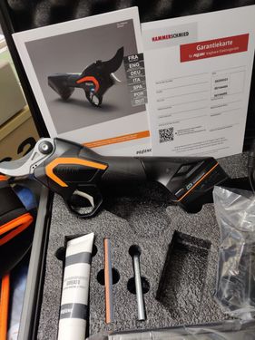 Rebschere mit Einsteckakku, perfekte Gleichgewichtsverteilung mit einem Gewicht von 955g, halbe Klingenöffnung durch Tastensensor aktivierbar, Schnittdurchmesser 35mm, Auslösehebel mit optischen Sensor, Einstellung der Parameter und Statistikdaten in der Pellenc App; Alles in einem robusten Kunststoffkoffer mit Zubehör. Rebschere C3X mit 2 Batterien ALPHA LITE und einem 3-fach Ladegerät ALPHA LITE C3X Profipaket: zusätzlich Batterie ALPHA LITE und TRAGESET C3X