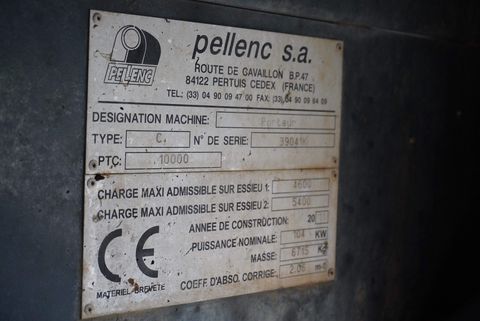 Pellenc Traubenvollernter 8390 mit Selectiv‘ Process BJ 2011, ca. 3460 Betriebsstunden JD Motor 4-Zylinder- Turbomotor Intercooler Tier III, 4525cm3 – 141 PS 2470 Upm 4 Antriebsräder mit Poclain Radmotoren Permanenter Allradantrieb TPI Vorderradbremsen Vorderreifen 380/70 R24 Hinterreifen 400/70 R24 2 Kameras 1 Bildschirm Elektronischer Sicherheitsneigungsmesser Elektronische Eigendiagnose Laufmeterzähler Luftgepolsteter Sitz Erntekopf Nr. 13 Aktiv Selectiv‘ Process mit Hochfrequenz Abbeerer und Rollensortiertisch Schüttelwerk System SMART 6 Schüttelarm Paare Pfahldämpfer mit Pfahlerkennung Automatische Schmierung 2 untere und 2 obere Gebläse zum Entfernen der Blätter 2 Behälter a 1250 Liter mit Füllstandsanzeige Satz Magnete Fernbedienung der BehälterKontaktdaten: