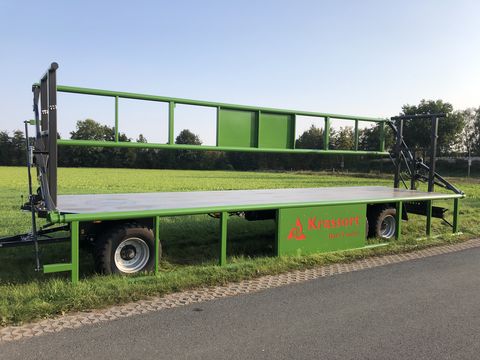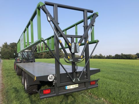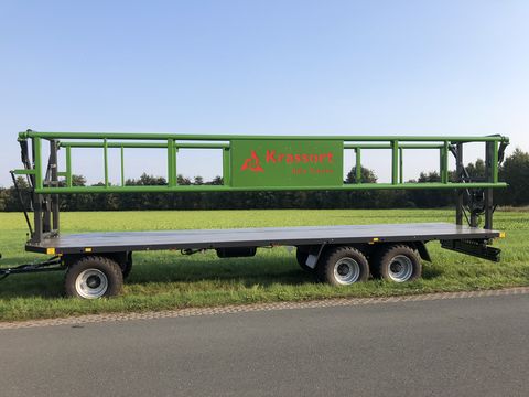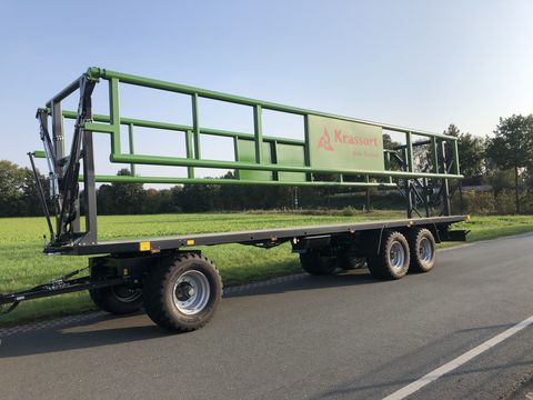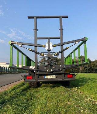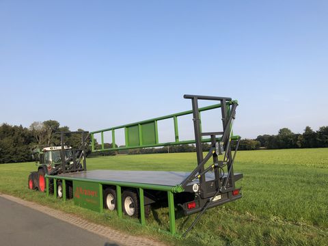 Beschreibung Der Krassort Transportballenwagen mit hydraulischen Klemmgattern wurde speziell für den Transport von Großballen entwickelt. Durch seine hydraulischen Seitengatter, die während des Beladevorgangs hydraulisch abgeklappt werden können, verfügt der Krassort Transportballenwagen als einziger Ballenwagen über ein Ballensicherungssystem, das dem Benutzer ein Höchstmaß an Komfort und Sicherheit bietet. Das lästige und zeitaufwendige ausrichten und vergurten der Ballen entfällt komplett. Durch das Hochklappen der Klemmgatter werden die Ballen auf dem Fahrzeug ausgerichtet und zwischen den Gattern festgeklemmt. Des weiteren zeichnet sich das Fahrzeug durch hohe Stabilität aus, die durch die Verwendung von Feinkornstahl und Großdimensionierten Rohrprofilen erreicht wird. Um die Handhabung weiter zu erleichtern, besitzt das Fahrzeug eine Druckluftbremse mit ALB und Handlöseventil, wodurch das lästige Kurbeln entfällt. Fahrwerk: 10t Achsen mit Drehkranz Bremsanlage: Druckluftbremse mit ALB Höchstgeschwindigkeit: 40 km/h optional 60 km/h Beladelänge: 10300 mm Spurweite: 2000 mm Breite ohne Beladung: 2540 mm Boden: 3 mm Stahlboden Fahrgestell: Nova grau Seitengatter: Gras grün (Farbe kann frei nach Kundenwunsch gewählt werden Klemmgatter: Doppelrohrgitterrahmen mit Parallellenker Zul. Gesamtgewicht: 24 to (technisch 30 to) TÜV: Tüv-Abnahme und DEKRA- Ladungssicherungszertifikat Zwischenverkauf und Irrtum vorbehalten