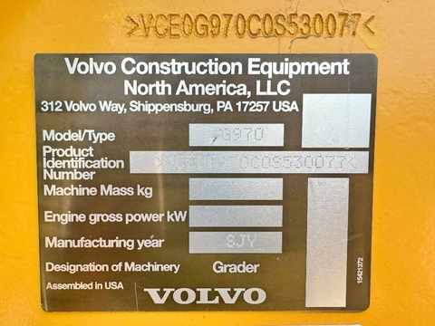 Volvo G970 Good Condition / 3 Tine Ripper Year: 2015 Reference number: BM005870 Hours: 15.253 Type G970 Location Veldhoven, Netherlands Certificate: EPA Available at Boss Machinery! This Volvo G970 Grader from 2015 has an engine power of 242 kW and counts 15253 operational hours. The total weight of this Volvo G970 is 20680 kg and the dimensions are 11.20 x 2.85 x 3.45. Furthermore, this G970 is equipped with Automatic Wipers, Air Conditioning, Heated Cab, Beacon, Extra hydraulic function. The Volvo Grader also has a EPA marking. Do you want more information or do you want to try the Volvo G970 at our yard? Please let us know. Sizes/Weights Weight: 20680 L*W*H: 11.20 x 2.85 x 3.45 Technical Information Drive configurations 6x4 Engine information Engine brand: Volvo Engine model: D9B Cylinders: 6 Turbo Capacity in kW: 242 Tires/Tracks 50%50% 20.5R25 50%50% 20.5R25 50%50% 20.5R25 Options Automatic Wipers Air Conditioning Heated Cab Beacon Extra hydraulic functionKontaktdaten: