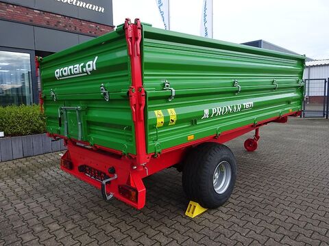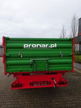 PRONAR Einachsdreiseitenkipper T 671 Auflaufbremse Technische Daten: Zul. Gesamtgewicht 7400 kg bei 25 km/h Zul. Gesamtgewicht 6000 kg bei 40 km/h Eigengewicht 1800 kg Nutzlast bei 25 km/h = 5600 kg Nutzlast bei 40 km/h = 4200 kg Ladevolumen 8,2 m³ Ladefläche 8,2 m² Pritsche innen LxB 4010 x 2010/2060 mm Gesamtmaße LxBxH 5630/2240/2080 mm Bordwand 500 mm + 500 mm, Plattformhöhe 1045 mm Bodenstärke (Boden/Bordwand) 4/2 mm Spurweite 1530 mm Deichselaugetragkraft 1600 kg bei 40 km/h Deichselaugetragkraft 800 kg bei 25 km/h Kippsystem dreiseitig Bereifung 400/60-15,3 Max. Geschwindigkeit 25/40 km/h Zylinderlänge 1540 mm / 8 Liter / 200 bar Kippwinkel hinten/Seite 50°/46° Serienmäßige Ausstattung: Stahlprofilbordwände zentrale Bordwandverriegelung Deichsel mit starrer Zugöse Ø 40 mm Bordwände 500 mm + 500 mm = 1000 mm Stützrad klappbar Obenanhängung Kurbelbremse Kippeinrichtung mit Abschaltvorrichtung Teleskopzylinder Beleuchtungsanlage 12 V elektrischer Anschluß hinten Aufstiegsleiter Keile mit Halter, Kornschieber in der Rückwand Rahmen rot RAL 3000, Aufbau grün RAL 6010 ABE/TÜV Zulassungsunterlagen Optionen auf Anfrage: Auslaufgosse Anhängekupplung Finanzierung und Anlieferung gegen Mehrpreis möglichKontaktdaten: