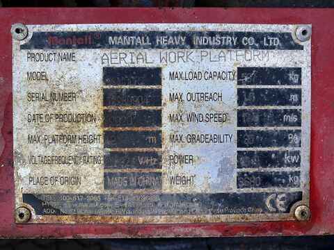 == More details (EN) == Classification: C Steering: 2 wheel steering Wheel / undercarriage: 4 stabilizers - automatic leveling Lifting speed up/down (sek.): 37,5 Gradeability (%): 35 Permissible leveling (degrees): 2-3 Platform height: 8000 mm Outlay: 2500 mm Outlay height: 10000 mm Platform width: 1600 mm Platform length: 2500 mm Platform extension: 1500 mm Free height: 170 mm 230V to the platformKontaktdaten: