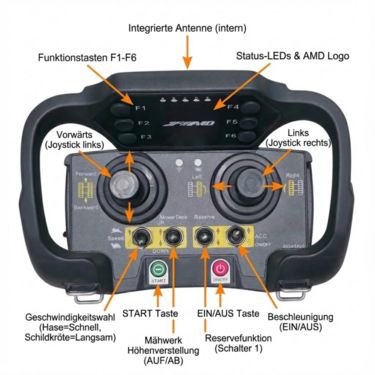 Der Spezialist für anspruchsvolles Gelände: AMD-R100 Der ferngesteuerte Böschungsmäher AMD-R100 ist die professionelle Lösung für die Pflege von unebenem, steilem und schwer zugänglichem Gelände. Ausgestattet mit einem kraftvollen 12 PS KOOP Dieselmotor und Raupenlaufwerk bietet er eine souveräne Traktion und hohe Flächenleistung (ca. 7,5 km/h) an Hängen mit einer Neigung von bis zu 40°. Steuerung: Steuern Sie den Mäher sicher und komfortabel aus der Ferne. Die Schnittbreite von 1000 mm in Kombination mit 40 robusten Y-Messern sorgt für schnelle und saubere Ergebnisse. Ein besonderes Highlight ist die elektrische Schnitthöhenverstellung – bequem per Fernbedienung passen Sie die Stoppelhöhe stufenlos von 20 mm bis 200 mm an die jeweiligen Gegebenheiten an. Modell: AMD-R100 Schnittbreite: 1000 mm Schnitthöhe: 20–200 mm (elektrisch einstellbar) Arbeitsneigung: 0–40° Motor: KOOP Diesel 192F (12 PS, 1 Zylinder) Abmessungen (L×B×H): 1560 × 1170 × 820 mm Inbetriebnahme: Starten des AMD-R100 (Anleitung) Stellen Sie den Schalter am Mäher zunächst auf die Parkposition (P) und schalten Sie die Zündung ein. Nehmen Sie die Fernbedienung in die Hand und drücken Sie gleichzeitig die Tasten "Start" und "An/Aus (On/Off)". Der Elektrostarter des Dieselmotors wird nun betätigt. Überprüfen Sie die Verbindung: Die Verbindungsleuchte an der Fernbedienung sollte dauerhaft grün leuchten. Schalten Sie nun den Schalter am Mäher von Position "P" auf "RC" (Remote Control). Der Mäher ist betriebsbereit und kann über die Fernbedienung gesteuert werden. Schmierung Im Luftfilter ist eine angemessene Menge Öl erforderlich. Der Schaumeinsatz ist regelmäßig zu reinigen; Ölwechsel sind rechtzeitig durchzuführen. In besonders schmutziger Arbeitsumgebung kann ein Ölwechsel alle 2–3 Stunden erforderlich sein. Auch das Motoröl ist regelmäßig zu wechseln. Es darf ausschließlich Motoröl des Typs 15W/40 verwendet werden. Luftkühlung Die Lüftungsöffnungen in der Nähe des Seilzugstarters sind regelmäßig zu überprüfen und sauber zu halten. Verstopfungen sind unbedingt zu vermeiden, da sonst eine Überhitzung des Motors auftreten kann. Modell: AMD-R100 Schnittbreite: 1000 mm Stoppelhöhe/Schnitthöhe: 20–200 mm (elektrisch einstellbar) Fahrgeschwindigkeit: 0–5 km/h Arbeitsneigung (Hangneigung): 0–40° Schneidmesser-Typ: Y-Messer (hängend) Anzahl Messer: 20 Sätze / 40 Stück Spurbreite (Raupen): 15 cm Bedienung: Fernsteuerung Startmodus: Elektrostarter Steuerspannung: 24 V Antrieb: Selbstfahrend, mit Dieselmotor Motorvariante: KOOP Diesel 192F (12 PS) - 1 Zylinder Flächenleistung: ca. 7,5 km/h Mähgeschwindigkeit Produktmaße (L×B×H): 1560 × 1170 × 820 mm Verpackungsmaße: 1620 × 1220 × 1030 mm Nettogewicht: 346 kg Bruttogewicht: 415 kgKontaktdaten: