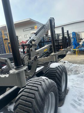 Der Trejon-Multiforest Forstanhänger, Modell MF1202, Baujahr 2026, ist ein hochmoderner Rückewagen, der speziell für anspruchsvolle Forstarbeiten konzipiert wurde. Mit einer beeindruckenden Breite von 245 cm bietet dieser Anhänger eine robuste und zuverlässige Lösung für den Transport von Holz. Der MF1202 verfügt über einen Ladequerschnitt von 2,5 m und eine Ladelänge von 4115 mm, was ihn ideal für den Transport großer Holzmengen macht. Der Anhängerrahmen ist mit vier Rungenpaaren ausgestattet, die zusammen mit den Teleskopstützbeinen für maximale Stabilität sorgen. Die Achsaufhängung und der Kurbelstützfuss erhöhen die Sicherheit und Benutzerfreundlichkeit während des Betriebs. Die von Ihnen gewählte optionale Ausstattung umfasst hochwertige Bereifung 520/50-17 TRAC, die speziell für typgeprüfte Anhänger ausgelegt ist, sowie eine Zugöse mit einem Durchmesser von 40 mm nach DIN-Norm. Die Deichsel MF850/950/1050 und der Bogie mit Druckluftbremse sorgen für ein reibungsloses Fahrverhalten und erhöhte Sicherheit. Die Eigenölversorgung mit einer 28ccm Pumpe, die auf der Deichsel montiert ist, gewährleistet eine effiziente Hydraulikleistung. Zusätzlich ist der Anhänger mit einer praktischen Motorsägenhalterung, einklappbarer Beleuchtung und einer ausziehbaren Rahmenverlängerung inklusive Rungenpaar ausgestattet, was die Flexibilität im Einsatz erhöht. Der Trejon Multiforest Kran V8400, der den Anhänger ergänzt, bietet eine maximale Hebekapazität von 1510 kg bei 4 m. Die von Ihnen gewählte Kransteuerung kombiniert mechanische und elektrische Elemente mit 2XY + 2 Hebeln und 2 elektrischen On/Off-Funktionen bei 80L. Ein Gelenk an der Kranspitze BR10/70/30 mit Pendelbremse, ein Flanschrotator CR400 und ein Holzgreifer G130 runden die Ausstattung ab und ermöglichen präzises und effizientes Arbeiten im Wald. Insgesamt bietet der Trejon-Multiforest Forstanhänger MF1202 eine ideale Kombination aus Stabilität, Flexibilität und Leistung, die den Anforderungen moderner Forstarbeiten gerecht wird.Zul. Gesamtgewicht (kg): 12000