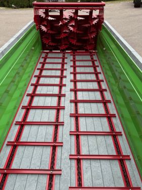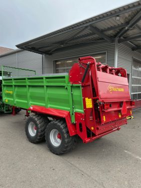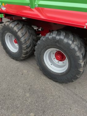 Obenanhängung, Tandemachse gefedert, WW-Gelenkwelle, 4-Walzen Streuwerk, Aufsätze 250 mm, Hydr. Heckklappe, Bereifung 520/50 – 17, Hydr. Kratzboden mit E-Control Light Bedienung, Kunststoffboden, 2-Leiter EU Druckluftbremse mit ALB, 40 Km/h, Ausstellungsmaschine