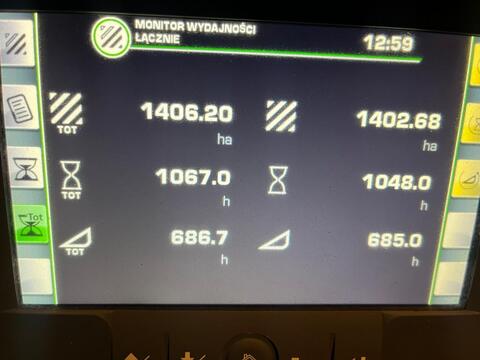 Trommel- / Rotorstunden: 690, Motor-Zylinderanzahl: Mercedes 7,7-Liter-Motor, Beleuchtung/Warntafeln, Kabine, Radio, Rundumleuchte, Kamera / Videoüberwachung, GPS System (Empfänger) ________ Turboseparator mit 590 mm Durchmesser, Haupttrommel 600 mm Kamerasystem, Klimaanlage, komfortable Kabine mit Platz für einen Beifahrer Großer Kraftstofftank (750 Liter) für 2 Tage Betrieb ohne Nachtanken Ausgestattet mit einem Kompressor für die tägliche Maschinenreinigung. 1.400 ha.Bereifung vorne: 800/65 R32