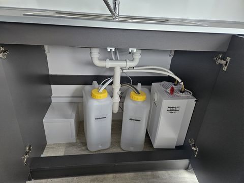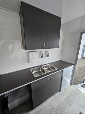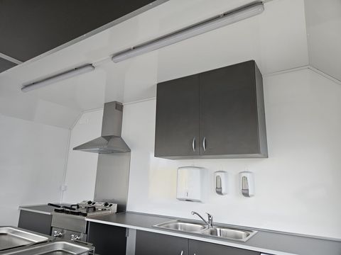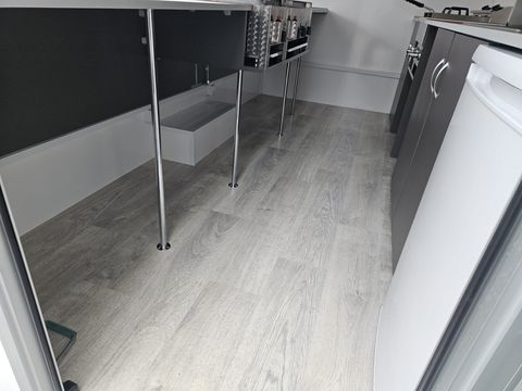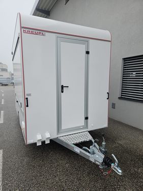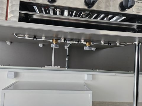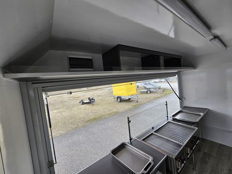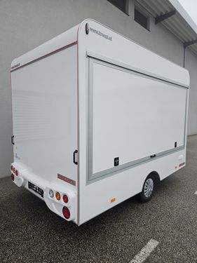 GG: 1.300 kg, NL: ca. 333 kg, EG: 967 kg Laderaummaße (LxBxH): 3650 x 2000 x 2300 mm Bereifung: 165 R13C Einachsanhänger, auflaufgebremst Aufbau: 30 mm GFK-Sandwich Wände u. Dach glatt, verz. Fahrgestell mit V-Deichsel Vorne oben abgerundet für aerodynamisches Fahren Verkaufsklappe rechts mit 2 Gasdruckfedern u. Sturmsicherung Taschenablage klappbar an der Verkaufstheke Siebdruckboden inkl. PVC-Belag Zusätzliche Tür für Gasflaschenschrank (passend für 2x11 kg) Einstiegstür vorne abschließbar mit Deichselauftritt Rangiergriffe, 4 Ausdrehstützen, Stützrad normal mit Halter Komplett ausgestattet mit: 2 Gasbräter (1x1-flam. mit Rost u. Pfanne, 1x3-flam. mit Rost u. Pfanne) 2 Elektrofritteusen (ca. 8 l pro Fritteuse) darüber Dunstabzughaube 1 Kühlschrank (230V), 1 Doppelspülbecken mit 2-flüg. Oberschrank Seifenspender, Papierhandtuchhalter Unterschrank mit Frisch- u. Abwasserkanister, 5 l Warmwasserboiler Standard Elektroinstallation 220V, Einspeisesteckdose nach CEE-Norm FI-Schalter, 16 Ampere Absicherung, Innenbeleuchtung, Steckdosen Inkl. Typenschein (COC) Inkl. aller notwendigen Unterlagen für die Betriebsanlagengenehmigung sowie Gasüberprüfung!! Verkaufsanhänger, Imbissanhänger, Food Trailer, Food Anhänger, Street Food Anhänger, Street-Food Anhänger, Kofferanhänger, Food-Trailer, Imbiss Anhänger, AseaZul. Gesamtgewicht (t): 1,3