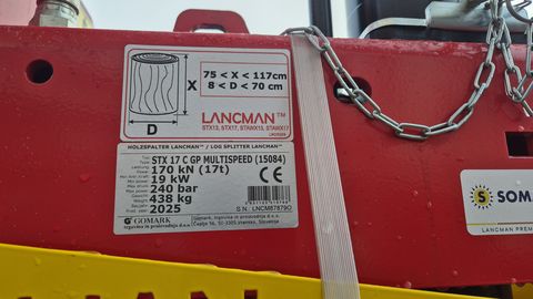✨Lancman Holzspalter ✔️ Modell : STX 17 AKTION ✔️ in serienmäßiger Ausführung ✔️ 17t Spaltkraft ✔️ MULTISPEED - 2 Spaltgeschwindigkeiten ✔️ HIGHSPEED - bis 48cm/s VOR ✔️ und 32cm/s RETOUR ✔️ mit Antrieb über die Traktorzapfwelle ✔️ Gelenkwelle serienm. nicht inkludiert ✔️ Eigenölversorgung ✔️ mit enorm großer hochwertiger Gußpumpe ✔️ und absenkbarem Spaltzylinder, ✔️ mech. Stammheber serienmäßig. ✔️ Grunddaten/Grundausrüstung: ✔️ Spaltleistung: 17 t, ✔️ SPALTMESSER mit Spezialwinkel-Breitkeil ✔️ für optimales Spalten des Holzes ✔️ 2 Spaltgeschwindigkeiten - Multispeed ✔️ Spaltlänge 117 cm, ✔️ Spalt Hub: 110cm ✔️ Stammheber für Holz mit Arretierung, ✔️ Saugfilter, ✔️ Magnetzapfen für Ölauslass, ✔️ Motorsäge Halter, ✔️ Handsappel Halter, ✔️ Forstaxthalter. ✔️ Kanisterhalterung ✔️ massive Vollstahl Bodenplatte ✔️ Spaltlänge bis 117 cm (Stufenlos verstellbar) ✔️ Zweigeteilter Spaltkeil für ✔️ optimales Spalten des Holzes ✔️ Komfortable 2-Hand-Bedienung, ✔️ einfaches festhalten des Holzes ✔️ möglich! (Halten + Schalten) ✔️ Außenliegende Filterpatrone ✔️ für einfache Wartung ✔️ Spaltgeschwindigkeit Zapfwelle: ✔️ Vorlauf 19,1-48 cm/sec, ✔️ Rücklauf 31,9 cm/sec. ✔️ Auch Modell STX 21 um EUR 4.249,- inkl. ✔️ lagernd und prompt verfügbar.Zul. Gesamtgewicht (kg): 17000