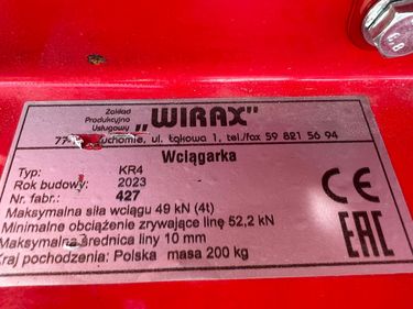 Wirax type KR4 forestry Winch Condition: New Year of manufacture: 2025 Pulling Capacity: 4 – 6 tons Cable length: 50 meters Weight: 200 kg Manufactured in: Poland PTO shaft included Clutch system Trailer towing hitch ----------- Contacts on main page: - Gerrie (english, german, dutch, romanian) - Ioan (english, german, romanian) - Abel (hungarian, english, romanian)Kontaktdaten: