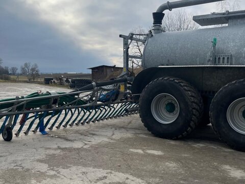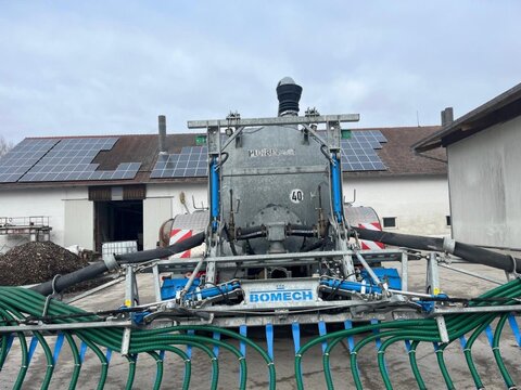 Tank ø 1800 mm Länge 5800 mm Selbsttragender Stahlblechfasskörper, verzinkt mit Radkästen Fassboden ausschwenkbar Untenanhängung mit Zugkugelkupplung K80 Stützwinde mit Übersetzungsgetriebe Feststellbremse beidseitig Schlauchauflegehaken Kompressor mit Druckschmierung Manometer, Überdruckventil, Doppelkugelventil, Schauglas Sauganschluss links vorne Blindanschluss hinten 2m Schlauch mit 3m Saugrohr Hydraulische Schieberbetätigung Schnellkuppler und Entlüftungshahn Lenkachse Radstand 1800mm hydr. Knickdeichsel mit Deichselfederung und Gasdruckdämpfer Breite 2700 – 3000mm Beleuchtung Y-Deichsel feuerverzinkt, mit Höhenverstellung , Oben- oder Untenanhängung möglich, Sauganschluss Fahrtrichtung links 6“ mit Schnellkuppler und Entlüftungshahn, alle Anschlüsse mit Kuppelschieber, Exzenterschneckenpumpe WANGEN GL 65 F (Fördermenge 4000 Liter / Minute), Steinfangmulde integriert unter der Exzenterschneckenpumpe mit Entleerungsdeckel mittels Exzenterverschluss, Druckleitung unter dem Behälter verlegt – Durchmesser 150 mm / 6“, Mengendosiereinrichtung am 3-Wege Schieber handbetätigt, Überlaufsicherung mittels 6“ Leitung oben am Fassbehälter, Weitwinkelgelenkwelle einseitig mit Scherbolzen autom. Befüllabschaltung (Steuerung über Füllungsanzeige) Umschaltung von Befüllen auf Rühren mit Elektrohydraulischer Steuerung Erweiterung um 1 Ventilblock Fass wurde größtenteils zum Verschlauchen eingesetzt Ausgebrachte Menge 18.000 Kubik Verschlauchte Menge 13.000 Kubik Bomech Speedy 15 m BJ 2019Kontaktdaten: