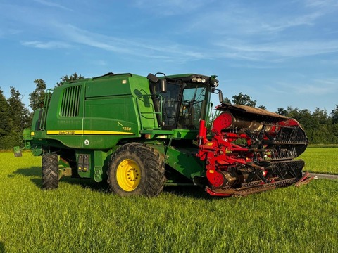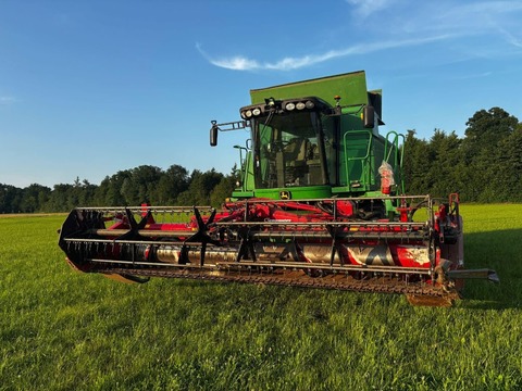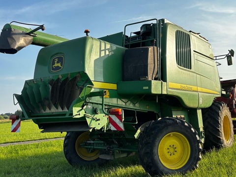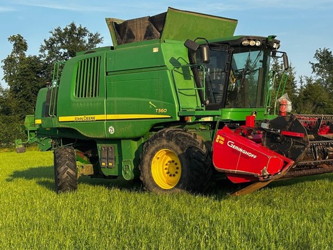 John Deere T560, 1976 Trommelstd. Auto Contour(Int. Nr. 15986) Baujahr 2010 3269 Motorstunden 1976 Trommelstunden ca. 2800 ha Außenbreite 3,29m 30km/h 5 Schüttler Maschine John Deere Motor 9L 277kW/ 372 PS Dreschtrommel 800mm mit zus. Zentrifugalabscheider (4 Trommel System)Überkehr-Volumenmessung mit AnzeigeKorntank, 1.000 Liter elektrische Verstellung für Siebe Wind und Dreschtrommel automatische DreschwerkseinstellungDreschtrommel - Reduziergetriebe 150 - 450 U/minKorntankauslaufrohr mit 110° EntleerwinkelAuto Contour Schneidwerksregelungautomatische HaspelführungDialASpeed automatische HaspeldrehzahlAnhängekupplung automatischTriebachse M 10-Loch 3-Gang Hydrostat Kraftstofftank 850 Liter Ertragsmessung Ertragskartierung vorbereitet Greenstar Ready! Komfortsitz luftgefedert Bord-Büro Kühlbox Klimaautomatik Radio Arbeitsbeleuchtung Halogen Multifunktionsgriff Rückspiegel elektr. einstellbar 2 Rundumleuchten Zusatzausrüstung ÜberbreiteKennzeichenbeleuchtung Nahbereichsspiegel Rückfahrkamera am Entleerrohr Bereifung: 710/70 R32 10-Loch (80%) 600/65 R30 6-Loch (70%) Geringhoff Schneidwerk Grainstar, 5,4m klappbar Es handelt sich hierbei lediglich um eine Anzeige, die zu Informationszwecke dient. Der Kaufvertrag kann nach unseren AGBs mit uns abgeschlossen werden.Kontaktdaten: