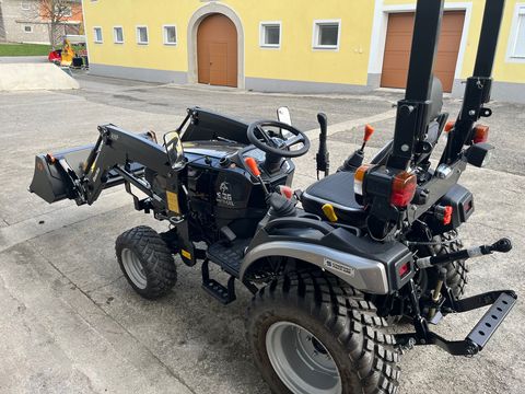 4x4 Allrad Antrieb mit Frontlader Black Panther Edition 26 Ps Mitsubishi Motor Top Ausstattung 3 Zylinder Diesel mit Quicke Frontlader ohne SS Motor & Leistung: 26 PS, 3-Zylinder, wassergekühlt – robust und effizient. Getriebe: 9 Vorwärts + 9 Rückwärtsgänge (Shuttle/Synchro) für präzise Kontrolle, besonders bei Frontlader- und Rangierarbeiten. Frontlader: Quicke/Alö Frontlader C12s mit Parallelführung und Euro-Schnellwechselsystem – einfaches Anbringen von Schaufel, Palettengabel etc. Hydraulik & Hubkraft: Ca. 600 kg Hubkraft am Heck; Alltagstauglich: Zuschaltbarer 4WD, Servolenkung, komfortabler Sitz, inklusive Straßenzulassung und Dokumenten für zulassungspflichtige Nutzung.Bereifung vorne: 220/55R12