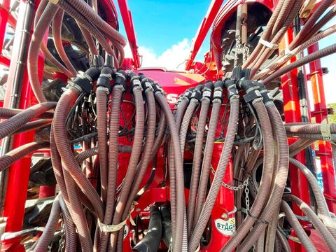 Reihen- / Körperabstand: 30,8/15,4 cm, Beladestufe, Hydraulische Klappung, Pneumatisch, Reihendüngerstreuer, Striegel ________ Doppeltank Saatgut + Duenger Frontreifenpacker 7.50-16 2-reihiges DiscSystem Duengerablage mit Einscheibenschar Reifenpacker 7.50-16 Andruckrollen Saatflussueberwachung Leistungsbedarf Traktor: ca. 205 - 260 KWReihenanzahl: 26 / 56