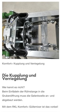TMK 5600 Komfort+ Güllenmixer- halbautomatische Kupplung und Verriegelung- starkes Holzlager- zwei Neigungszylindern- Knick und der Kuppelzylinder mit Folgesteuerung- Rührstangenlänge 5 Meter- Flügeldurchmesser 600mm- Stützfuss Satndard- Traktorseitig zwei doppelwirkende Steuerventile notwendig- Optional GelenkwelleDie Kupplung und VerriegelungWer kennt es nicht?Beim Einfädeln der Rührstange in die Grubenöffnung muss die Gelenkwelle an- und abgebaut werden.Mit dem RKL Komfort+ Güllemixer ist das vorbei!Unsere patentierte halbautomatische Kupplung und Verriegelung verbindet mittels einer Klauenkupplung Rührstange und Zapfwelle! Der Knick und der Kuppelzylinder sind mit einer ausgeklügelten Folgesteuerung verbunden. es ist keine Fehlbedienung möglich! es ist nur ein doppeltwirkender Steuerkreis für die Kupplung notwendig! Die Kupplungseinheit ist mit Federn mit der Verriegelung verbunden – verdreht sich der Flügel beim Eintauchen und die Kupplung fluchtet nicht mehr springt sie beim ersten wegdrehen, Seriennummer:2024TMK02