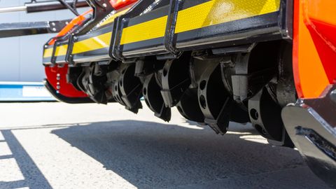 Arbeitsbreite von 200 cm für den Einsatz mit Traktoren mit einer Mindestleistung von 110 PS - 200 PS Getriebe 1000 U/min Die Maschine wurde für Oberflächenarbeiten konzipiert und kann maximal Baumstämme mit einem Durchmesser von 250 mm zerkleinern. Rotordurchmesser von 430 mm, ausgestattet mit einem Satz von 46 geschmiedeten, austauschbaren Fräswerkzeugen mit erhöhter Haltbarkeit dank der Verwendung von Wolframkarbidplatten und Möglichkeit einer schnellen Demontage durch Zweischraubenverriegelung. Die Kraftübertragung erfolgt durch ein Querganggetriebe, das von einem renommierten italienischen Hersteller geliefert wird. Die dynamisch ausbalancierte Rotorwwelle, ausgestattet mit hochwertigen schwedischen kugelförmigen Rollenlagern, die für schwere Lasten ausgelegt sind, garantiert einen langen, problemlosen Maschinenbetrieb bei hohen Drehzahlen. Die Riemenscheiben werden von fünf Riemen auf beiden Seiten angetrieben. Der Einsatz eines der effizientesten Antriebsriemen auf dem Markt. Eine spezielle Riemenrolle und optimierte Besetzung ermöglichen eine effizientere dynamische Energieübertragung, größere Flexibilität und eine bessere Wärmeableitung. Die Antriebsgetriebeelemente sind gegen Beschädigungen geschützt und können zur Wartung geöffnet werden. Die robuste, langlebige Schweißkonstruktion mit einem Gesamtgewicht von 1810 kg, die auf hochwertigen Komponenten weltweit renommierter Hersteller montiert wird, gewährleistet einen stabilen Betrieb im schwierigsten Gelände. Standardausstattung: – Dreipunktverbindung, Kategorie III, – 1" 3/4 S6 Eingangswelle – 1000 U/min – Querganggetriebe, – doppelseitiger Riemenantrieb, – 10 Außenriemen (2x5 Stück) – Rotor Ø 430 mm - Arbeitstiefe 50 - 100 mm – austauschbare geschmiedete Fräswerkzeuge, – höhenverstellbare, verschleißfeste Stahlkuffen, – zweireihiger vorderer Kettenvorhang, – Ausführungspunkte für eine einfache Schmierung – Trägerarm – hydraulisch gesteuert – Betriebsgeschwindigkeit 0–4 km/h - 1810 kg EigengewichtZul. Gesamtgewicht (kg): 1810