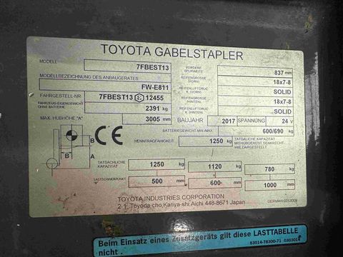 TOYOTA Elektrostapler 7FBEST13 Baujahr: 2017 363 ORIGINAL-Betriebsstunden Tragkraft: 1300 kg Hubmast: Duplex-FREIHUB Hubhöhe: 3000 mm Bauhöhe: 2055 mm Freihub: 1455 mm Bereifung: Super-Elastik - Seitenschieber - Batterie 24 V / 875 Ah - Ladegerät - Scheinwerfer vorne u. hinten SEHR GUTER ZUSTAND !!! Für etwaige Rückfragen steht Ihnen Herr Thomas Lehner natürlich gerne zur Verfügung !Kontaktdaten: