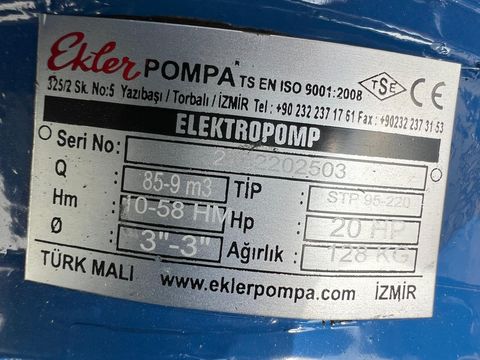 Ekler electric pump for irrigation . Condition : New We have 2 models : - STP-80 (diameter in and out 3” / 10 Hp = 7.5 kw / Hm = 38 m / 85 m3/h ) - 1500 euro - STP 95-220 (diameter in and out 3”/ 20 Hp = 15 kw / Hm= 58 m / 85 m3/h ) - 2050 euro ------ Contacts on main page: - Gerrie (english, german, dutch, romanian) - Ioan (english, german, romanian) - Abel (hungarian, english, romanian) Office in Halchiu : 14 km from Ghimbav international Aeroport Office in Budila : 30 km from Ghimbav international AeroportKontaktdaten: