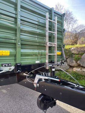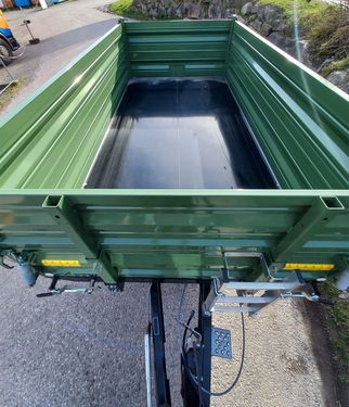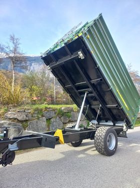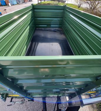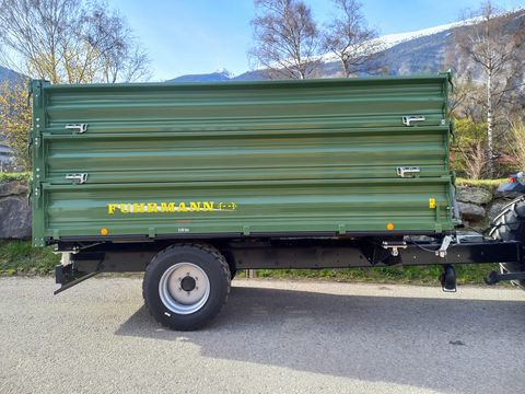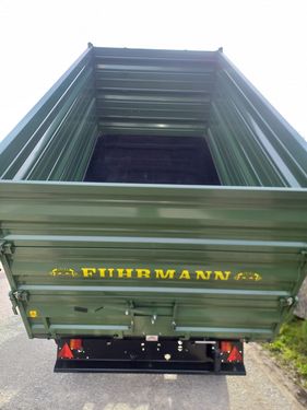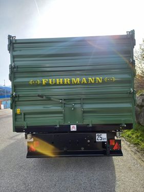 Fuhrmann Einachs-3S-Kipper Maße: - Plateaugröße: 4140 x 2150 mm - Bordwände: 500 + 500 + 500 mm Technische Daten: - Höchstzulässiges Gesamtgewicht: 7,8 Tonnen - Gesamtbreite: 2150 mm - Gesamtlänge: 4140 mm - 3x Stahlbordwände, jeweils 500 mm hoch - Pendelwände an den Seiten und hinten - Ecksteher - Getreideschieber hinten - Bordwandschließfedern - Stahlboden: 4 mm dick Kippeinrichtung: - Hydraulische Dreiseiten-Kippanlage - 1 Kippzylinder mit Hubbegrenzungsventil Bremsen & Abstützung: - Hydraulikbremse ohne Lastanpassungsventil (für innerbetriebliche Zwecke) - Stützrad hochklappbar und höhenverstellbar Bereifung: - 445/45 R 19.5 LKW, Leao ADM 991 - Typenschein: 25 km/h, LandwirtschaftZul. Gesamtgewicht (kg): 7800