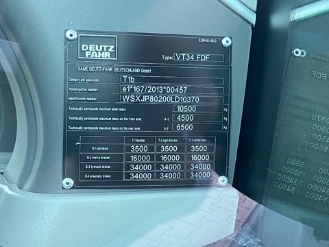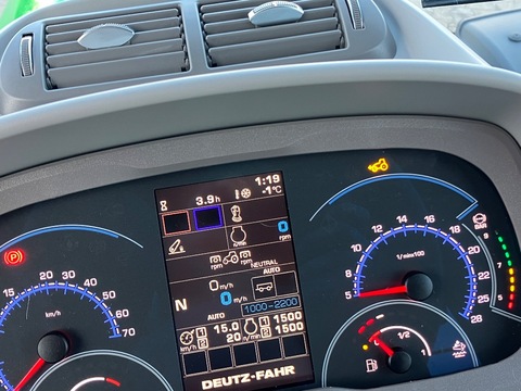 Neumaschine 30 Jahre Aktionsmodell FARMotion 45 Stage V Motor. Common Rail System. 4 Zylinder. 3849 cm³ Hubraum. VTG Turbo Intercooler. EGR (external Gas Recirculation), DOC (Diesel Oxidation Catalyst), DPF (Diesel Particulate Filter), SCR (Selective Catalyst Reduction). Nenndrehzahl 2100 U/Min. Homologierte Leistung (ECE R 120): 148 PS/ 109,1 kW. Max Leistung (ECE R 120): 156 PS/ 115 kW. Hydrostatische Lenkung mit separater Pumpe. Elektrohydraulische Betätigung für Zapfwellenkupplung. Batterietrennschalter in der Kabine. elektronische Parksperre (EPB) Dichtungen für Zapfwelle Unterlegkeil Hydrostatische Lenkung mit Zylinder doppeltwirkend Batterie: 12V-180Ah-800A LED Positionsleuchte und LED Blinker vorne sowie LED Bremslicht, LED Positionslicht und LED Blinker hinten Vorbereitung für ABS Steckdose Bedienpanel für Arbeitsscheinwerfer (WOLP) Auspuff nach oben am A-Pfosten Kraftstofftank: 260 Liter + AdBluetank 25 Liter Tankdeckel ohne Schloss Luftfilter mit Staubejektor elektronisch gesteuerter Viskolüfter "eVisco" Elektronischer Motorregler Abgasstufe V Standard Ausführung MaxiVisionPro-Kabine mit elektronischen Hecksteuergeräten 4 Zusatzsteuergeräte elektro-hydraulische Betätigung, alle mit Mengen- und Zeitregelung Drucklose Rücklaufleitung hinten Load-Sensing Verstellpumpe mit 120 l/min Förderleistung Anhängebock lang Autom. Anhängekupplung hinten D 38 mm, Rasterschiene Fangschalenhalter Kat.II-III/II Einstellbare automatische Seitenstabilisierung Unterlenker links und rechts Hubstreben beidseitig verstellbar Heckkraftheber mit elektronischer Regelung EHR Data Traffic 5 Jahre ermöglicht Fernsupport und RTK- NTRIP (Spurführung mit RTK Genauigkeit; RTK-Signal muss vom lokalen Anbieter erworben werden) Radiovorbereitung mit 2 Lautsprechern Beifahrersitz gepolstert mit Sicherheitsgurt Multifunktionsarmlehne rechts verstellbar Automatik-Sicherheitsgurt für Fahrersitz Scheibenwischer/ -waschanlage hinten MaxiVision-Kabine mit MaxCom-Joystick: neigbare und verstellbare Lenksäule mit integriertem InfoCenterPro, Lüftungs- und Heizsystem, gekühltes und beheiztes Getränkefach, getönte Scheiben (seitlich und hinten), 12-V-Steckdose an der Frontkonsole MaxCom-Armlehne mit 2 JollyButtons (anstelle der Taster für die Fronthydraulik) auf dem MaxCom Fahrhebel. Anzahl der Klaviertasten ist abhängig von der Steuergerätekonfiguration Armaturenbrett "InfoCenterPro" mit 5" TFT Farbdisplay (km/h) Rückenverlängerung für Fahrersitz Karosseriefarbe DEUTZ-FAHR grün Elektrohydraulische Allrad- und Differentialsperrenzuschaltung, ASM-System (Automatisches Strang Management) CTM 4G Communication Telematic Module mit integrierter e-Sim Karte, automatische Einwahl in das lokal beste Netz. Nur in Verbindung mit Connectivity-Paket. Das CTM ermöglicht verschiedene weitere Anwendungen (ggf. kostenpflichtig): RTK NTRIP, Flottenmanagement, Agrirouter. Standard Kabinenfilter Powershuttle Getriebe einstellbar Kennzeichenhalter vorne auf Auspufftopf Frontscheibe geschlossen Seitenscheiben links und rechts ausstellbar Heckscheibe ausstellbar Kotflügel hinten mit Fernbedienung Zapfwellenstummel hinten wechselbar Heckzapfwelle 540-540E-1000 Vorwahl elektronisch Spezifikation für deutschsprachige Märkte Elektrische Anlagen Standard Maschine Bedienungs- und Wartungsanleitung (Deutsch) Homologation für EEC Markt (Mother Regulation) Zeichen Geschwindigkeit Heckscheibe Schilder "Warnhinweise" Werkzeugkasten Powershuttle: Nasse V/R-Lamellen- Doppelkupplung mit elektro-hydraulischer Betätigung, Hebel unter dem Lenkrad Stufenloses Getriebe mit 3 Fahrstrategien (AUTO, PTO, MANUELL), Tempomat, automatischer Wechsel zwischen den Arbeitsbereichen "Normal" und "Heavy Duty". Aktiver Stillstand "PowerZero". Felgen vorne und hinten voll verschweißt Kotflügel vorne, verstellbar und schwenkbar, Breiten angepasst Optionen: -Sitz Max-Comfort Dynamic MSG97AL DDS EVO Dynamische Federung, autom. Positionierung, Klimasystem drehbar 8° (links) bis 15° (rechts) -XLarge Vision: Elektrisch verstellbare und beheizte XL-Teleskoprückspiegel mit LED-Beleuchtung -Einstellbarer RAM-Handyhalter an der rechten A-Säule -Zusatzhubzylinder 100mm -Hydraulischer Oberlenker im Heck -Unterlenker mit Schnellkupplern (Walterscheid) Kat. III -Oberlenker Kat. II für FKH mit automatischem Fanghaken -Elektrisches Steuergerät für Frontkraftheber -Doppeltwirkender Frontkraftheber (Hubkraft 3.000 kg) -Externe Bedienung für Heckkraftheber und Zapfwelle am linken und rechten Heckkotflügel und einem DW Hecksteuergerät -Power Beyond Kupplung (bei LS-System) -Komfortpaket für Frontkraftheber: Fernbetätigung FKH und 7-polige Steckdose (nicht in Verbindung mit FA192); 1 Steuergerät elektr. mit 2 doppelt wirkenden Anschlüsse vorn. -Druckluftanschluss am linken Aufstieg für die einfache Reinigung der Kühler, der Kabine und Filter. -Steuertastenfeld MMI -iMonitor3 in 12" beinhaltet TCSC, GEO, VRC, AUX-N, UT, ISOXML-Datenaustausch -Vorbereitung ISOBUS Gerätesteuerung nach ISO 11783 (Steckdose Heck, Steckdose für Terminal in der Kabine) -Signalwandler CAN zu PWM, für die Installation eines zusätzlichen (Frontlader) Joysticks und bis zu drei Steuergeräten -Batterieanschluss für Überbrückungskabel -Wiederholscheinwerfer über Blink- und Positionsleuchten LED -4 Arbeitscheinwerfer LED in Motorhaube -2 Arbeitsscheinwerfer auf Blinkposition IV Generation LED -Steckdose 12V + ISO 11786 Anschluss hinten rechts auf Seitenkonsole -2 Arbeitsscheinwerfer LED IV hinten unten -Klimaautomatik -Rückspiegel am rechten A-Holm und Spiegel in der Heckscheibe mit Sicht auf Anhängekupplung -Dach mit 8 LED Arbeitsscheinwerfer IV Generation -Dachluke Glas mit UV-Beschichtung -Schiene für einen zusätzlichen Monitor zwischen A- und B-Säule mit Tablet-Halterung -SR20 PRO: GNSS Empfänger für RTK NTRIP. Kompatibel mit Galileo/GPS/Glonass. Empfang von RTK NTRIP nur in Verbindung mit CTM + Aktivierung des Datenpakets -AGROSKY Performance Steering ready
