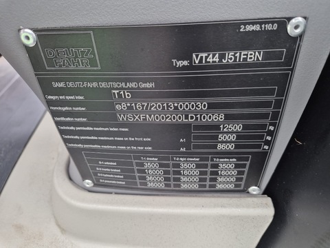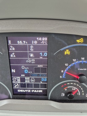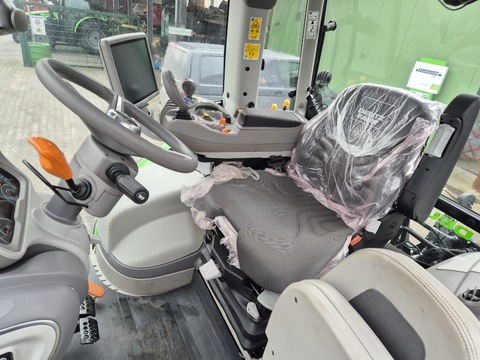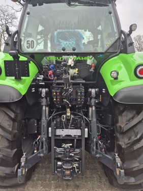 DEUTZ TCD 6.1 L06 4V (STAGE V). 4 Ventile DCR (Deutz Common Rail). 6 Zylinder. 6057 cm³ Hubraum. SCR System (Selective Catalytic Reduction), EGR (External Gas Recirculation) und passiver DPF (Diesel Partikel Filter). 2100 rpm Nenndrehzahl Power bei Nenndrehzahl (ECE R 120): 155 PS/114 kW. Max power (ECE R 120): 161 PS/119 kW. Power bei Nenndrehzahl mit Boost (ECE R 120): 161PS/119 kW. Max power mit Boost (ECE R 120): 171 PS/126 kW. Stufenloses TTV Getriebe, einstellbares Powershuttle. Multifunktionale Armlehne und Joystick für Bedienung von: Motor, Getriebe, Zapfwellen, Hydraulik und Steuerventilen. Hydrostatische Lenkung mit separater Pumpe. Kotflügel hinten mit Betätigung für Hydraulik, Zapfwelle und Steuerventile. elektronische Parksperre (EPB) Zweileitungs Druckluftbremsanlage M.R. Version EU/DE Unterlegkeil Fronttriebachse mit adaptivem Federungssystem, 100% Lamellensperrdifferenzial ASM gesteuert sowie Ölbad-Scheibenbremsen für unabhängige Bremse an allen 4 Rädern. Batterie: 12V-180Ah-800A Bei Joystick für Steuergeräte ohne Umschaltung P1,P2,P3 Vorbereitung für ABS Steckdose Vorbereitung für Bedienung I-Monitor über Touchscreen Bedienpanel für Arbeitsscheinwerfer (WOLP) Auspuff nach oben am A-Pfosten Kraftstofftank: 350 Liter + AdBluetank 29 Liter Tankdeckel ohne Schloss Abgasstufe V Standard Ausführung MaxiVisionPro-Kabine mit elektronischen Hecksteuergeräten Remote-Anschlüsse hinten, mit Abreißfunktion und Ölauffangsystem Drucklose Rücklaufleitung hinten Anhängebock lang Einstellbare automatische Seitenstabilisierung Unterlenker links und rechts Mechanischer Oberlenker mit Fanghaken automatisch Hubstreben beidseitig verstellbar Heckkraftheber mit elektronischer Regelung EHR Externe Bedienung für Heckkraftheber und Zapfwelle am linken und rechten Heckkotflügel und einem DW Hecksteuergerät Beifahrersitz gepolstert mit Sicherheitsgurt Multifunktionsarmlehne rechts verstellbar Automatik-Sicherheitsgurt für Fahrersitz Scheibenwischer/ -waschanlage hinten MaxiVision-Kabine mit MaxCom-Joystick-Steuerung: verstellbare Lenksäule mit integriertem InfoCentrePro, Belüftungs- und Heizsystem, gekühltes und beheiztes Getränkefach, getönte Gläser (seitlich und hinten), Ambientebeleuchtung Armaturenbrett "InfoCenterPro" mit 5" TFT Farbdisplay (km/h) Klimaanlage manuell Rückenverlängerung für Fahrersitz Karosseriefarbe DEUTZ-FAHR grün CTM 4G Communication Telematic Module mit integrierter e-Sim Karte, automatische Einwahl in das lokal beste Netz. Nur in Verbindung mit Connectivity-Paket. Das CTM ermöglicht verschiedene weitere Anwendungen (ggf. kostenpflichtig): RTK NTRIP, Flottenmanagement, Agrirouter. Kennzeichenhalter vorne auf Auspufftopf Heckscheibe ausstellbar, Heckscheibe unten fixiert Schilder "Warnhinweise" Zeichen Geschwindigkeit Heckscheibe Homologation für EEC Markt (Mother Regulation) Bedienungs- und Wartungsanleitung (Deutsch) Elektrische Anlagen Standard Maschine Spezifikation für deutschsprachige Märkte Hinterachse mit Flanschverbindung Powershuttle mit SENSE CLUTCH Felgen vorne und hinten voll verschweißt Kotflügel Verbreiterung Außenbreite 2400 mm Optionen: -Autom. Anhängekupplung D 38 mm, und Kugel Anhängekupplung K80 höhenverstellbar -Anhängesystem Ausführung Sauermann -Sitz Max-Comfort Dynamic XXL Dynamische Luftfederung, elektr. verstellbare Lendenwirbelstütze, Längs- und Querfederung, breiter Rahmen drehbar 8° (links) bis 15° (rechts) -DAB+ High Level Radio mit Freisprechfunktion. Voll integrierte Antenne im Kabinenhimmel. FM/DAB Tuner; Bluetooth, USB und Klinkeneingang. Integration der letzten Anrufe in das InfoCenterPro. -XLarge Vision: Elektrisch verstellbare und beheizte XL-Teleskoprückspiegel mit LED-Beleuchtung -MaxCom-Multifunktionsarmlehne ISOBUS-Expertversion. Mit vollständig integrierter Steuerung aller Traktorfunktionen: Getriebe, Handgas, 2 Motordrehzahlen, Heckkraftheber, Zapfwelle, Hydraulik, ComforTip, Frontkraftheber Positionssteuerung (in Kombination mit FB003/005). Die Armlehne ist mit allen hydr. Bedienelementen ausgestattet (unabhängig von der Hydraulikkonfiguration) somit können alle AUX-N Tasten belegt werden und man kann gleichzeitig die Steuergeräte betätigen. -Bereifung: 540/65R28 vorne, 650/65R38 hinten -Bereifung Marke Trelleborg 38"-42"-46" -Kotflügel vorne verstellbar und schwenkbar mit Fußstütze -Fangschalenhalter Kat.II-III/II -Zusatzhubzylinder (D. 100mm) mit 9700 kg Hubkraft -Unterlenker mit Schnellkupplern und Fanghaken von Walterscheid (Oberlenker mechanisch) -Oberlenker Kat. III für FKH mit automatischem Fanghaken -elektrisches Steuergerät für Frontkraftheber -Frontkraftheber mit doppeltwirkenden Zylindern (Hubkraft 4110 kg) und externer Bedienung -Lizenz für Fleed Management in Ergänzung zu 5 Jahre Data Traffic -Power Beyond Kupplung (bei LS-System) -4 Zusatzsteuergeräte elektro-hydraulische Betätigung, alle mit Mengen- und Zeitregelung -Komfortpaket für Frontkraftheber: Fernbetätigung FKH und 7-polige Steckdose (nicht in Verbindung mit FA192); 1 Steuergerät elektr. mit 2 doppelt wirkenden Anschlüssen vorn. -Load-Sensing Verstellpumpe mit 160 l/min Förderleistung -Heizung für Kraftstofffilter -iMonitor3 in 12" beinhaltet TCSC, GEO, VRC, AUX-N, UT, ISOXML-Datenaustausch -Vorbereitung ISOBUS Gerätesteuerung nach ISO 11783 (Steckdose Heck, Steckdose für Terminal in der Kabine) -Wiederholscheinwerfer über Blink- und Positionsleuchten -4 Arbeitscheinwerfer LED in Motorhaube -10 Arbeitsscheinwerfern LED positioniert am Dach. 4 vorne und 6 hinten. -Dachluke Glas mit UV-Beschichtung -Schmutzabweisende Bodenmatte für Kabine -Schiene auf der Oberseite der Kabine (zwischen rechter A- und B-Säule) zur Befestigung von Fremdgeräten -Antennenhalter auf dem Dach -AGROSKY Performance Steering ready mit "EASY STEER" Funktion zur Einstellung der Lenkübersetzung -Frontscheibe geschlossen, Seitenscheiben links und rechts ausstellbar -Kabine, pneumatisch gefedert, niveaureguliert 