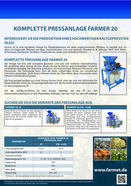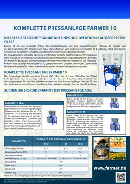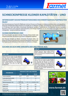 Ölpresse der Firma Farmet Typ UNO 1FM – Messemaschine, unbenutzt Zum Verkauf steht eine Ölpresse UNO 1FM aus Messebestand. Die Maschine ist unbenutzt und in einwandfreiem Zustand. Dieses Modell eignet sich zum Pressen aller gängigen sowie weniger gängigen Ölsaaten mit einem Ölgehalt ab 12 %. Die Optimierung des Pressprozesses erfolgt durch: # individuelle Einstellung der Drehzahl # Auswahl der passenden Ausgangsdüse Technische Daten: # Leistung: 8–12 kg/Std. # Antriebsleistung: 1,1 kW # Frequenzumrichter: ja # Netzversorgung:1 + PE + N, 1 × 230 V, 50 Hz # Abmessungen (L×BxH): 870 × 300 × 480 mm # Gewicht: 75 kg Highlights: # Messemaschine, unbenutzt # für viele Ölfrüchte geeignet # kompakte Bauform # einphasiger Anschluss # flexible Prozesssteuerung # inkl. Holzgestell Ideal für Landwirtschaft, Direktvermarkter oder kleinere Produktionsbetriebe.Kontaktdaten: