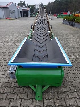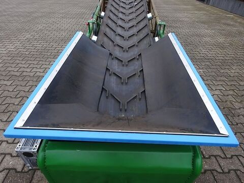 GEBRAUCHTMASCHINE: Gebr. Muldenförderband, 15,50 m lang Stollengurt Gurtbreite 650 mm mit Bandabstreifer Stollenhöhe 15 mm Aufsteck-Getriebemotor 3 kw, NEU Ein/Aus Schalter, NEU Gummierte Antriebsrolle unten, NEU Bandgeschwindigkeit ca. 79 m/min Einlauftrichter, NEU Alle Laufrollen, 39 + 7, NEU Fahrgestell mit Luftbereifung Höhenverstellung mit Winde, NEU Maximale Überladehöhe ca. 7 - 8 m Gewicht ca. 1100 kg TOP-Zustand Gegen Mehrpreis: Frequenzregler für stufenlose Geschwindigkeitsverstellung Anlieferung gegen Mehrpreis möglich.Kontaktdaten: