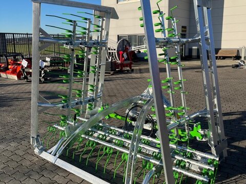 Unsere Greenkeeper ist super Multifunktional: – Die stabilen Striegelzinken schlitzen die Grasnarbe ein und lüften damit den Boden (einbringen von Sauerstoff) – Der Feuchtigkeitshaushalt wird durch gesundes Bodenleben verbessert (vermindert die Austrocknung des Bodens) – Entfernt Unkraut, abgestorbene Grasbestände und Moos – Wühlmaus- und Maulwurfshaufen werden beseitigt, Bodenunebenheiten werden ausgeglichen – Stalldung/Gülle wird zerkleinert und in die Grasnarbe eingearbeteit – Das Gras erhält mehr Licht und Luft, was den Gräsern hilft sich zu stärken und zu wachsen – Geringere Futterverschmutzung bringt höhere Futterqualität – Sehr gut geeignet zum Nachsäen oder zur Neuansaat auf kahlen Flächen – Aufgrund seiner vielen Möglichkeiten können Sie den Greenkeeper mehrmals im Jahr verwenden – Gepflegtes und stetig nachgesätes Grünland bringt oft den doppelten Futterertrag! Spezifikationen: • Feuerverzinkter, robuster, modularer Rahmen • Rahmen mit Winkelprofil Front und Rückseite • 3 Reihen mit 10mm Doppelte Zinken (60st) • 12-Stufen Tiefenverstellung • Dreipunktsbetrieb Kat. 2 • Mechanischen Verriegelung 2x Zylinder • Sehr robuste Schaniergelenke • Gleitschuhe und Eckenschutz • Hydraulik schön verarbeitet • Transportbreite 2715mm • Gewicht 635kgKontaktdaten: