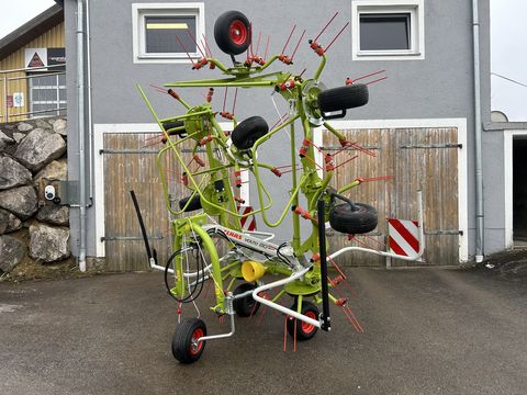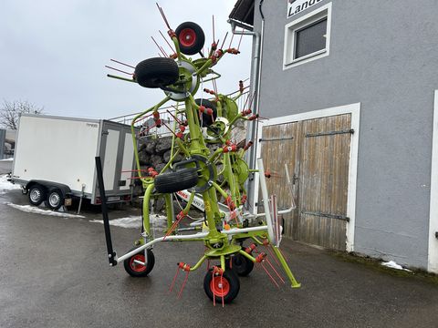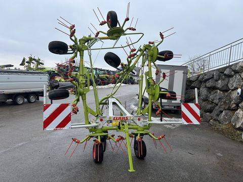 Wender für 3-Punkt-Anhängung, Kat. II Arbeitsbreite 7,70 m Antrieb 540 U/min 8 Kreisel mit je 5 Zinkenträgern Kreiseldurchmesser 1,30 m CLAAS Kraftflusslenker (CKL): Dämpfelemente für ruhiges Nachlaufverhalten, auch bei Kurvenfahrt Direkte Abstützung des gesamten Gewichts in einer Kraftlinie gegen die Unterlenker des Traktors Automatische Zentrierung beim Ausheben am Vorgewende PERMALINK Antriebskonzept: Alle Kreisel beweglich miteinander verbunden Für Klappbewegungen bis zu 180° für kompakte Transportstellung MAX SPREAD Gutflusskonzept: Um 29,3° nach hinten angewinkelte, tangentiale Zinkenanordnung Zinken arbeiten 33% länger nach vorn gerichtet als bei konventioneller Zinkenanordnung Für ca. 10% höhere Arbeitsgeschwindigkeiten als bei konventioneller Zinkenanordnung Gleichmäßige Breitverteilung des Ernteguts Werkzeuglose Streuwinkelverstellung Doppelfederzinken Ø 9,5 mm mit je 5 Windungen Zinken gleichlang und in Super C-Zinkenqualität Zinkennachlauf auf -7°/0°/+7° einstellbar Zinkenverlustsicherung, integriert Kreiselbereifung 8 x 16x6.50-8 Transportbreite 2,93 m Gewicht: ca. 910 kg Hydraulikvoraussetzungen: 1 x dwHektar (ha): 0