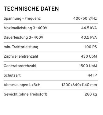 ELMAG - Zapfwellen - Stromerzeuger Anzeigegeräte für Grundeinstellung zur einfachen Einstellung der korrekten Zapfwellendrehzahl: - Analoge Spannungsanzeige - LED-Anzeige Spannung OK/Nicht OK - Analoge Frequenzanzeige - LED-Ampelanzeige Frequenz hoch/OK/niedrig Bedienpanel und Steckdosenpanel: - Multifunktionsanzeige (V, A, Hz) - Umschalter Haus-/Feldbetrieb - ISO-Wächter zweistufig mit Fehleranzeige - Spannung- und Frequenzüberwachung - 1h-Steckdose für Haus- sowie Feldbetrie VORTEILE Haus- und Feldbetrieb möglich durch Betriebsartenwahlschalter Ideale Versorgungslösung für die Land- und Forstwirtschaft Umfangreiche Anzeige- und Sicherheitsfunktionen (Ampelanzeige für Frequenz- sowie Spannung) Spannungs- sowie Leistungsanzeige für alle 3 Phasen mittels Multifunktionsanzeigemodul Inklusive AVR-Regelung für elektronische Verbraucher (zB. Melkroboter, Fütterungsanlagen, usw.) Einstellbare Frequenz- undKontaktdaten: