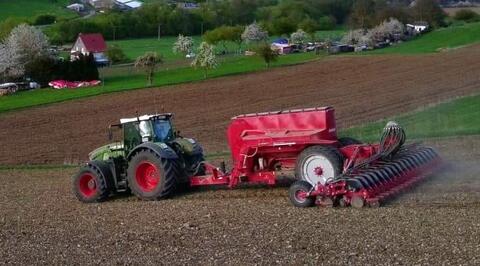 Reihen- / Körperabstand: 45 cm, Flächenleistung: 4800 ha, Mulchsaat, Zweischeibenschare ________ mit Zwillingsbereifung 300/95R46Reihenanzahl: 18