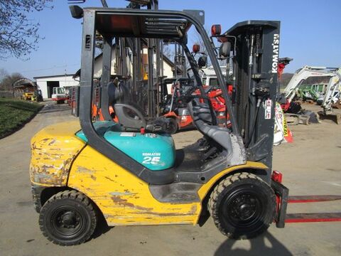 Bauart: Frontstapler / Dieselstapler, Tragkraft: 2500kg, Hubhöhe: 4700mm, Bauhöhe: 2100mm, Bereifung vorne: Vollgummi Einfach 80 - 100% , Bereifung hinten: Vollgummi Einfach 80 - 100% , Anbaugeräte: Seitenschieber, Sonderausstattung: 3. Ventil, Arbeitsscheinwerfer hinten, Arbeitsscheinwerfer vorn, Beschreibung: Dieselstapler KOMATSU FD25T-16R - - 2,5 Ton. Hubkraft - - Seitenschieber - - Triplex-Freihubmast - - Bauhöhe 2,10m - - Hubhöhe 4,70m - - Baujahr 2008 - - 5154 Betriebsstunden lt. Zähler - - 4-Zylinder Komatsu Dieselmotor 50 PS - - Vollgummireifen ca. 90% - - Arbeitsscheinwerfer vorne - - mechanische Hydraulikhebel - - neuer Sitz wird noch montiert