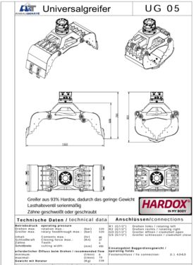 A&T UG05 – Der Greifer für Profis und anspruchsvolle Baggerfahrer „Made in Bayern“, überzeugt mit robuster Bauweise und hoher Leistung für den täglichen Einsatz. Gefertigt zu 93 % aus Hardox-Stahl, bietet er maximale Stabilität bei geringem Gewicht kombiniert mit hoher Schließkraft. Serienmäßig mit Lasthalteventil ausgestattet und wahlweise mit geschweißten oder geschraubten Zähnen erhältlich. Hochwertige AVS Marken-Rotatoren „Made in Österreich“ sorgen für präzises Arbeiten & hohes Drehmoment. Bei Festanbau für 4,0 – 6,5 to Bagger geeignet. Gewicht mit Rotator: 238kg Öffnungsweite: 1322mm Schalenbreite: 450mm Schließkraft: 37Kn – 37000N Druck Drehen & Schließen: 320 Bar Wir beraten Sie gerne, mehr Details auf Anfrage und weitere Größen Verfügbar Preis bezieht sich auf das dargestellte Modell inkl. Rotator (inkl. 20% Mehrwertsteuer) Achtung: Aufnahmen, Schläuche & Kupplungen separat anfragen (nicht im Grundpreis). Aufnahme mit Grundplatte auf Anfrage Verfügbar: Lehnhof MS03 / Martin M03 / SW10 Lehnhof MS08 / CW10 / Martin M10 / SW20 Lehnhof MS10 / SW33 / SMP620 M18 / SW35 MS21 / CW20.30.40 / SW48 Oilquick / Likufix und andere Versand über Spedition Europa weit möglich: Weitere Details Siehe Datenblatt bei den Bildern Bestens geeignet für, Takeuchi, Kubota, Kobelco, Cat, Liebherr, Hitachi, Wacker Neuson, Bobcat, Dosan, Case usw Mit Martin, Geel, Engl, BDS, Lehnhof, Wimmer Aufnahme usw.Kontaktdaten: