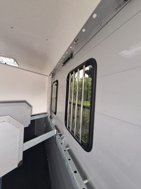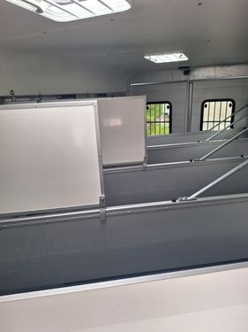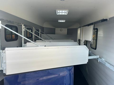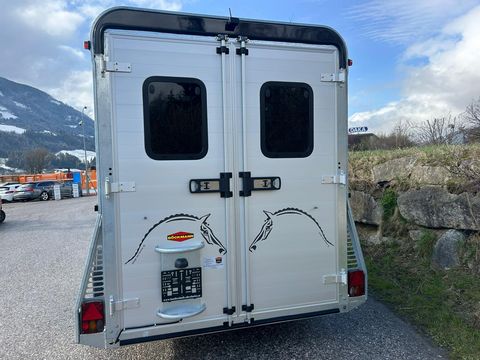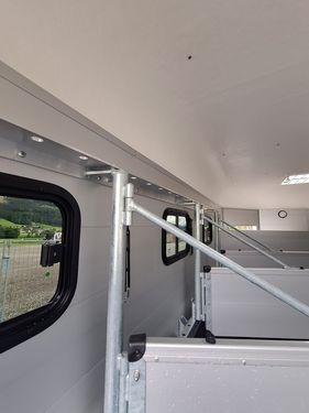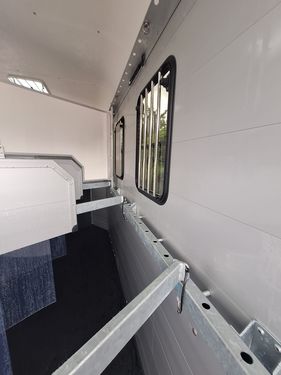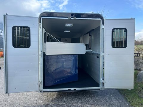 Erstzulassung: Juli 2025 Abzugeben wegen Nichtgebrauch Technische Daten: Anzahl Tiere: 4 , Gesamtgewicht: 3500 kg, Innenmaße: 4570x2000x2400mm, Gesamtmaße: 5705x2540x2810mm, Leergewicht: 1684 kg, Aufbaumaterial: Alu Fahrwerk: Radstoßdämpfer, 4 Stück, Bereifung 14", Stahlfelge, Kugelkupplung abschließbar, Fahrgestell tiefergelegt mit Radstoßdämpfer, Mechanische Auflaufbremse, Schwerlast-Automatik-Stützrad Aufbau: Lichtanlage mit Rückfahrscheinwerfer und Stecker 13-polig, 4 Scharniere an der Hinterklappe, 1 Anbindestange außen rechts, 1 Anbindestange außen links, 2 Dachlüfter in der Polyesterhaube, Heckstrebe geschlossen, Hebevorrichtung, Innenhöhe 2400 mm, 2 Rangiergriffe, 3 große Schiebefenster rechts, 3 kleine Schiebefenster links, Aluminiumboden anstatt Siebdruckboden, Planenlift mit integriertem Netz, Eloxierte Aluminium-Bordwände, 2100 mm hoch, Gummibelag auf Hinterklappe (integrierte Trittleisten und Seitenstopp), 5 umlaufende Spezialprofilbügel, Kennzeichenhalter mit 2 Auftritten, Einzelradkotflügel, Kunststoff (schwarz), Farbe Polyesterhaube: silber-metallic, Dekore Innenraum: 4 Heunetzhaken, Kunststoffschaufel mit Stiel, Besen mit Teleskopstiel, Spiegel an der Sattelkammertür, Gummiboden verklebt und versiegelt, Großer Sattelraum mit fester Wand, 2 Innenleuchten, 6 Trensenhaken im Sattelraum, 4 Sattelhalter für Western-Sättel, 2 Türnetze, 220 x 360 mm, Seitenwand links und Zwischenwand zum Sattelraum mit Trittschutz, 4 teleskopierbare, seitlich verstellbare Alu-Trennwände mit PVC-Behang, 4 Futtertröge Enthaltenes Zubehör: 2 x Kopftrennwand 1 x Airlineschiene rechts 4 x Anbindeketten zu Airlineschiene 1 x Videoüberwachungsanlage inkl. RückfahrkameraZul. Gesamtgewicht (kg): 3500