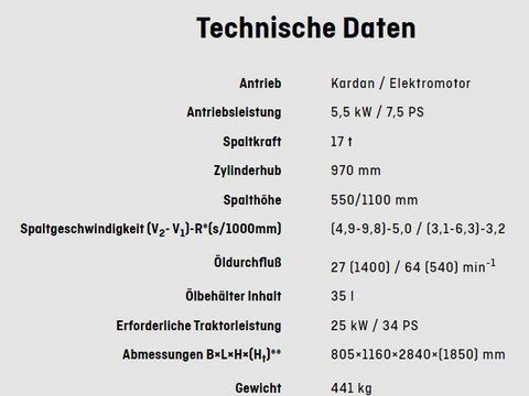 Standard Ausrüstung "2 Speed Automatic" Ventil mit zwei automatischen Spaltgeschwindigkeiten / Graugusspumpe, integrierter Doppelboden-Ölbehälter mit großer Ölmenge +Antrieb Kardan / Elektromotor +Antriebsleistung 5,5 kW / 7,5 PS +Spaltkraft 17 t +Spalthöhe 550/1100 mm +Spaltgeschwindigkeit (V2- V1)-R*(s/1000mm) (4,9-9,8)-5,0 / (3,1-6,3)-3,2 +Öldurchfluß 27 (1400) / 64 (540) min-1 +Ölbehälter Inhalt 35 l +Erforderliche Traktorleistung 25 kW / 34 PS +Abmessungen B×L×H×(Ht)** 805×1160×2840×(1850) mm +Gewicht 441 kg +Graugusspumpe serienmäßig.Eigengewicht (kg): 441