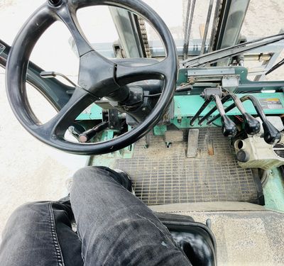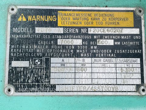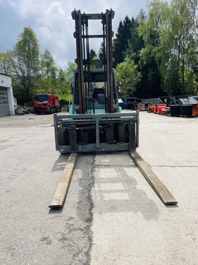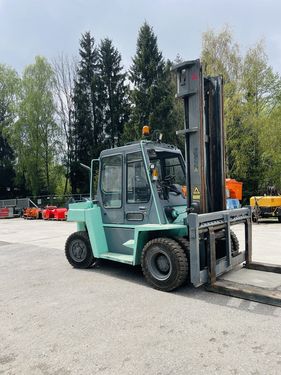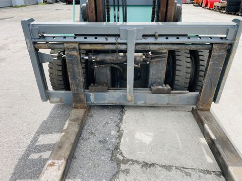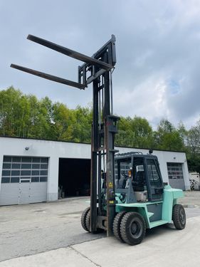 Gabelstapler Mitsubishi FD7, Erstbesitz, Baujahr 2000, 69 kW, 7.375 Stunden, 6 Zylinder Diesel Motor, Reifen Profil 90%, Hubhöhe 5,20m (Gabel unterkante), Seitenverschub, Gabel verstellbar, Zinkenverlängerung (2,6m), LED Scheinwerfer, Eigengewicht 9,34 to, Hubkraft 7 to. Preis: € 18.000,- exkl. Mwst.