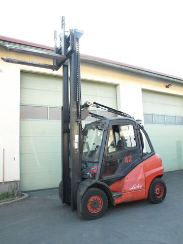 Linde Dieselstapler gebraucht Typ: Linde H40D Nenntragfähigkeit: 4000 kg - Duplex Mast - Bauhöhe: 2720 mm - Vollkabine inkl. Heizung - Hubhöhe: 3700 mm - Freihub: 150 mm - 3. + 4. + 5. Steuerventil - Seitenschieber + Zinkenverstellgerät + Ausschubgabelzinken - Bereifung: Super Elastik - inkl. Arbeitsscheinwerfer vorne und hintenKontaktdaten: