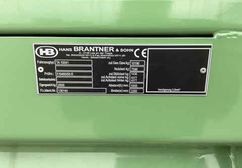 Klassifizierung: Neumaschine; Seriennummer/Fahrgestellnummer: 136140; Stützlast: 1450; Laderaumbreite (cm): 208; Laderaumlänge (cm): 407; Höchstgeschwindigkeit (km/h): 25; Vorderreifen Größe: 19.0/45-17; Hinterreifen Größe: 19.0/45-17; Typ der Anhängerbremse: Pneumatisch; Zentralverriegelung: Mechanisch; Anhängeart: Anhängevorrichtung; Achsfederung: Ja; Auslaufschieber: Ja; Anhängekupplung hinten: Ja; Anzahl Vorbesitzer: 1; Weitere Maschinenmerkmale: Brantner Tandem-Dreiseitenkipper TA 10041 Neumaschine - prompt verfügbar 25 km/h Österreich mit 2-Leiter Druckluftbremse Nutzlast 8.000 kg Bordwandhebefedern rechts u. links Stahlbordwände 600 mm Stahlaufsatzwände 600 mm Bordwandversteifung links u. rechts AuslaufgosseZul. Gesamtgewicht (kg): 10190