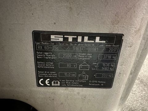 STILL Elektrostapler RX 60-25 L Baujahr: 2017 2208 ORIGINAL-Betriebsstunden Tragkraft: 2500 kg Hubmast: TRIPLEX-Freihub Hubhöhe: 4600 mm Bauhöhe: 2200 mm Freihub: 1500 mm Bereifung: Super-Elastik - Seitenschieber - Kabine - Batterie 80 V - Bauj. 2019 - Ladegerät - STVO-Beleuchtung - Arbeitsscheinwerfer vorne u. hinten - BlueSpot vorne u. hinten GUTER ZUSTAND !!! Für etwaige Rückfragen steht Ihnen Herr Thomas Lehner natürlich gerne zur Verfügung !Kontaktdaten: