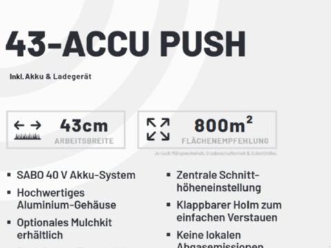 Sabo Akku Rasenmäher, Modell 43-Accu 43 cm Schnittbreite für Flächen bis 500 m² Schnitthöhenverstellung zentral in 8 Stufen (von 2,5 - 8,0 cm) Fangkorb mit 45 Litern Volumen Führungsholm 3-fach verstellbar, mit Schnellspannern Variabler, zuschaltbarer Fahrantrieb (2,0 - 4,0 km/h) Aluminium Chassis mit 15 Jahren Garantie Sabo TurboStar System inklusive 1x 4 Ah Akku und SchnellladegerätKontaktdaten: