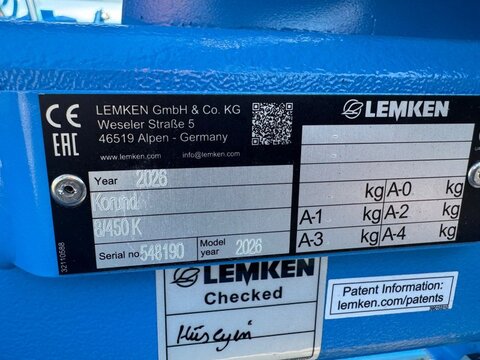 Lemken Saatbettkombination Korund 8/450 klappbar Baujahr 2026 Marathonzinken 30x12x400 Doppel-Zahnstangenkrümelwalzen D330 / D270 mm Multischiene vorne Halter für Spurlockerer (ohne Spurlockerer) Beleuchtungsanlage Maschine hat ganz leichte Lackschäden. Preis netto Ab Standort und wie am Standort zu besichtigen. Für weitere Fragen stehen wir Ihnen sehr gerne zur Verfügung.Kontaktdaten: