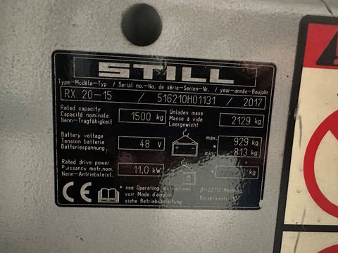STILL Elektrostapler RX 20-15 Baujahr: 2017 4668 Betriebsstunden Tragkraft: 1500 kg Hubmast: TRIPLEX-Freihub Hubhöhe: 4650 mm Bauhöhe: 2060 mm Freihub: 1470 mm Bereifung: Super-Elastik - Seitenschieber - Batterie 48 V / 625 Ah - Ladegerät - NEU !!! - Arbeitsscheinwerfer vorne - BlueSpot hinten GUTER ZUSTAND !!! Für etwaige Rückfragen steht Ihnen Herr Thomas Lehner natürlich gerne zur Verfügung !Kontaktdaten: