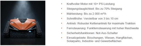 LIEFERBAR AB Juli 2026 Mähbreite 55 cm , Motorleistung 13 PS Mähwerk Mulcher, Abmessung LxBxH 100×120×61 cm Steigungstauglichkeit Bis zu 70% Gewicht 270 kg Steuerung Fernbedienung Intelligente Mulchtechnologie für steile Hänge Technische Highlights: -Innovatives Hybridsystem -Elektrischer Antrieb für komfortables anfahren -Volle Power im Mähbetrieb mit Verbrennungsmotor für dauerhafte LeistungKontaktdaten: