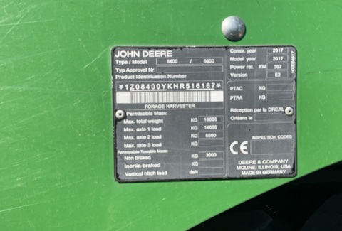Klassifizierung: Gebrauchtmaschine; Seriennummer/Fahrgestellnummer: 1Z08400YKHR516167; Abgelesene Trommelstunden: 2290; Geerntete Fläche: 1; Erntevorsatz: Ja; Vorsatzgeräte Art: Pickup; Vorsatzbreite (in Metern): 3; Vorsatzgerät Hersteller: John Deere ; Vorsatzgerät Modell: 639; klappbarer Erntevorsatz: Ja; Zentralschmierung: Ja; Art der Klimatisierung: Automatisch; Elektronische Gegenschneide: Ja; Elektronische Schleifeinrichtung: Ja; DEF/AD BLUE: Ja; Bordcomputer: Ja; Allrad: Ja; Ertragskartierung (via GPS): Ja; Ertragsmessung: Ja; Arbeitsscheinwerfer vorne: Ja; Anzahl Arbeitsscheinwerfer vorne: 14; Arbeitsscheinwerfer hinten: Ja; Erntevorsatzantrieb: Variabel; Art der Gegenschneide: Gras, Mais; Messer Art: Gras, Mais; Anzahl der Messer: 56; Grasausrüstung: Ja; Beschleuniger Spalt Einstellung: Mechanisch; Radio: Ja; Automatische Schnittlängen-Einstellung: Ja; Fernbedienung: Ja; Siliermittelanlage: Ja; Anhängevorrichtung: Ja; Service Historie: Ja; Anzahl Vorbesitzer: 1; Weitere Maschinenmerkmale: Kemper 360 plus 8 reihen MaisBereifung vorne: IF800/70 R38